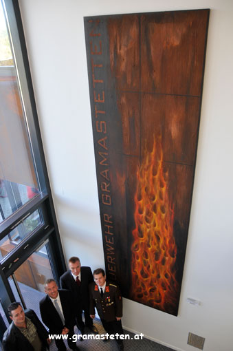 Feuerwehrhauses. Titel des Kunstwerkes: "Rostige Flammen"